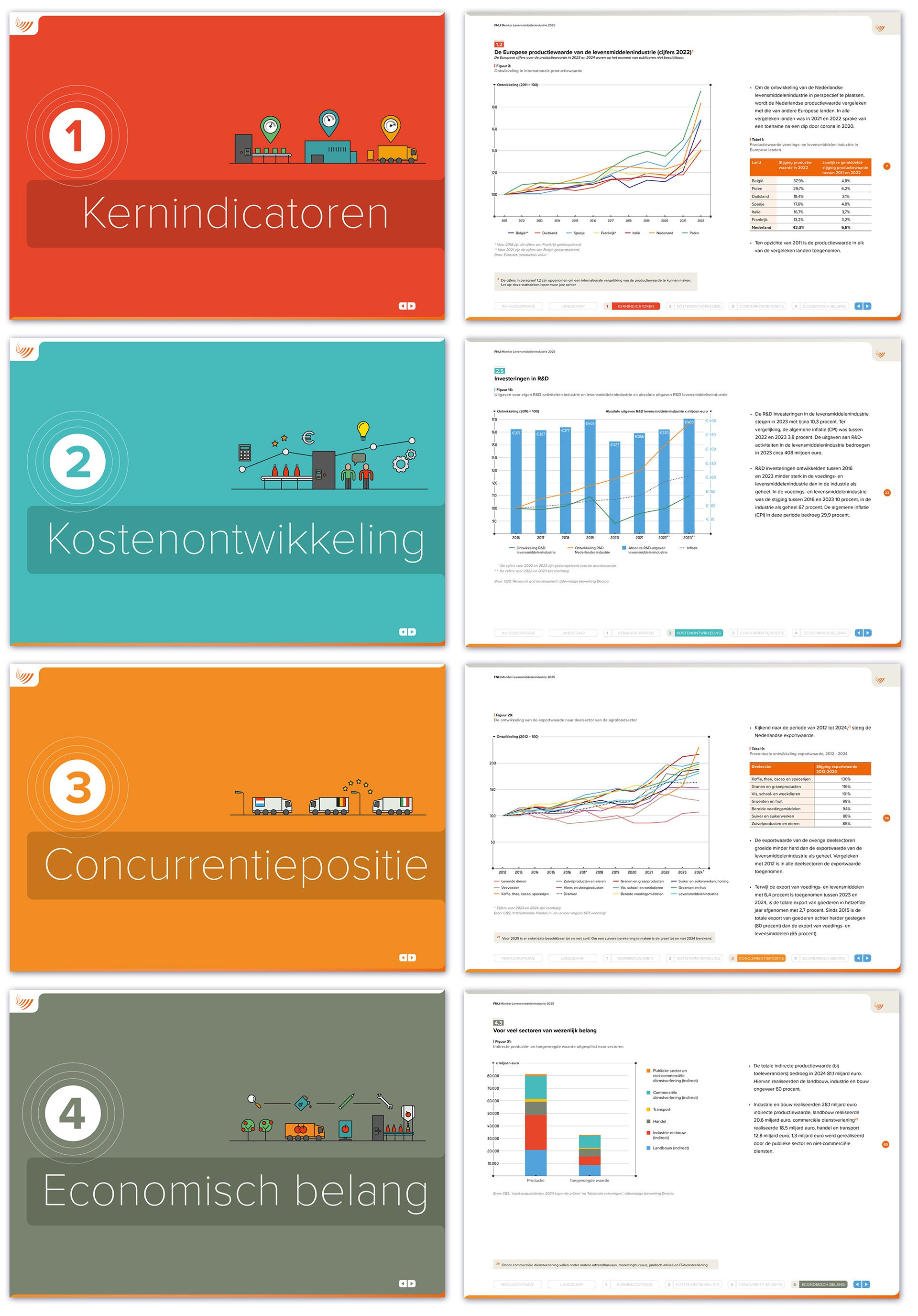 De monitor combineert heldere infographics met interactieve elementen, waardoor complexe data toegankelijk en inzichtelijk wordt voor een breed publiek. Van productiewaarde en arbeidsproductiviteit tot de positie van de sector binnen de Nederlandse economie: alle informatie is vertaald naar een overzichtelijk en consistent visueel verhaal.