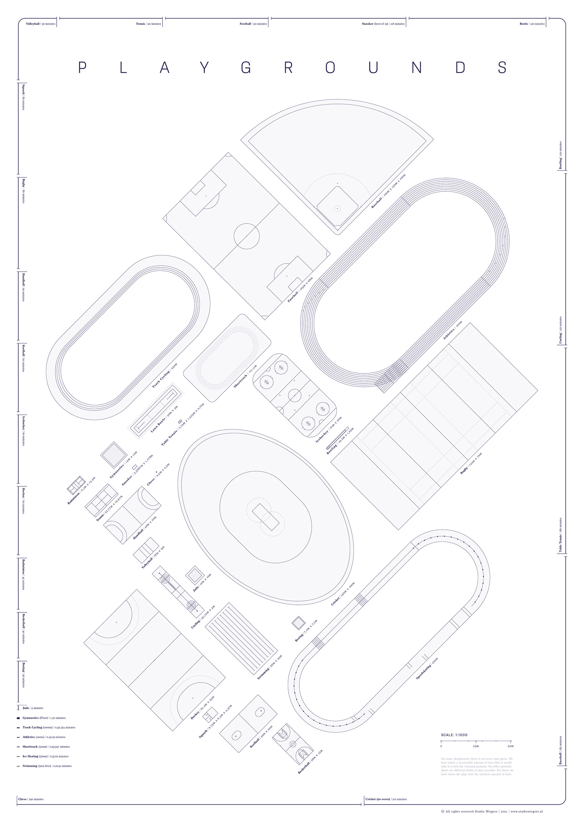 A graphic representation of various playing fields, developed at a 1:1,000 scale and presented as an A2 poster. Surrounding the fields are the playing times for each sport, ordered by the duration required to complete a game. This makes it possible to compare the surface area needed with the time it takes to play. For example, a 50-metre swimming pool requires a large amount of space for the shortest playing time — around 20 seconds — whereas a chessboard represents the opposite: on just a quarter of a square metre, a game can last for hours.