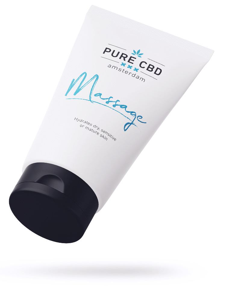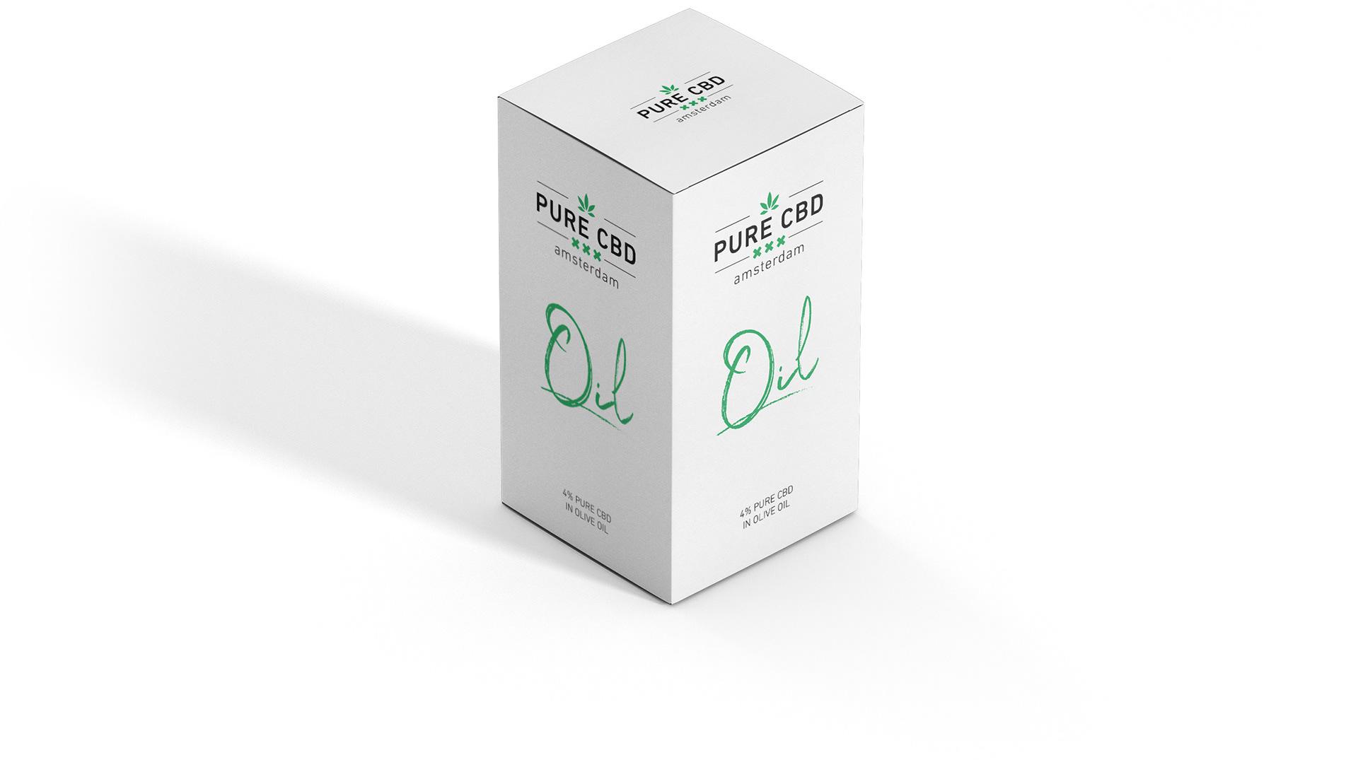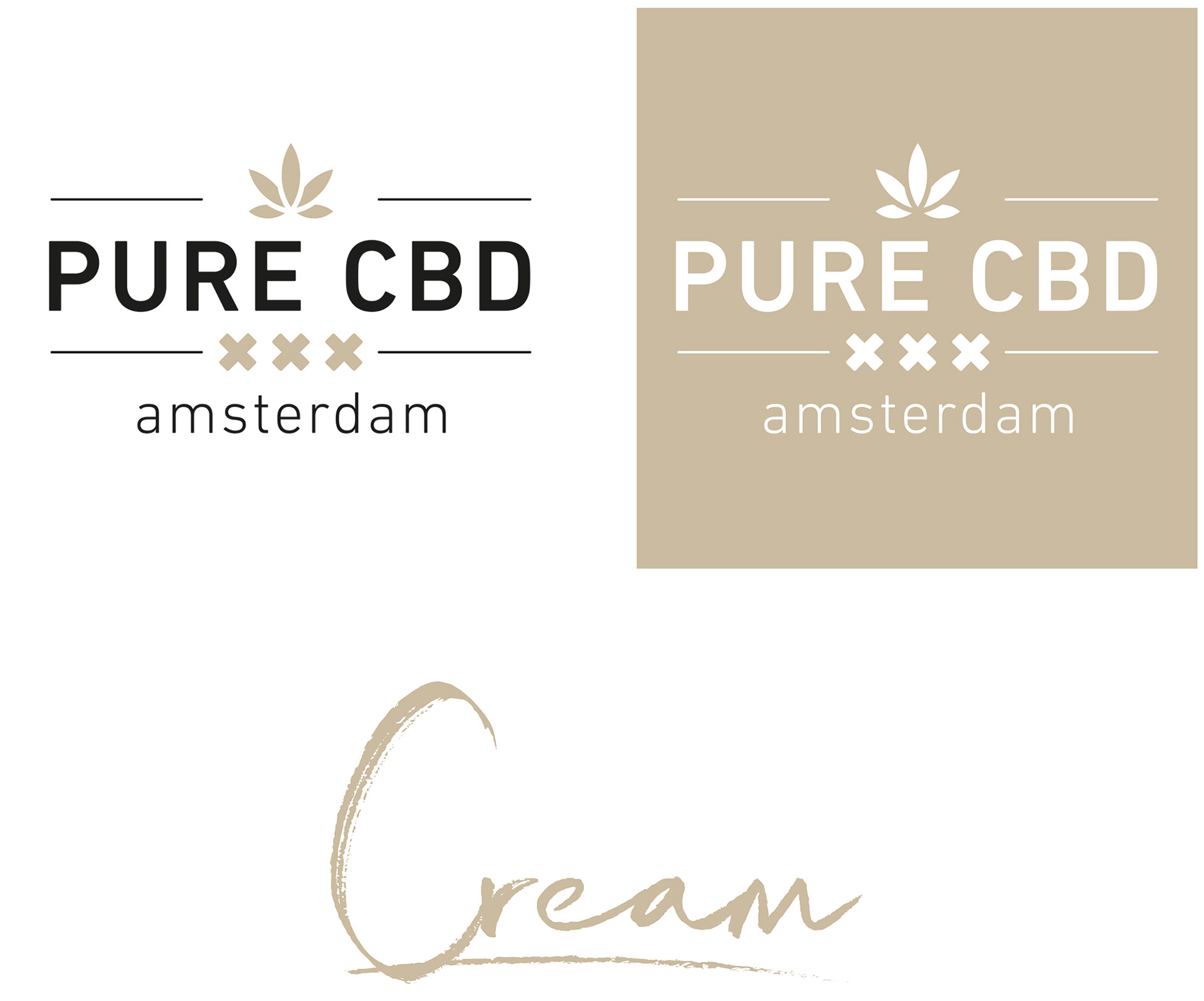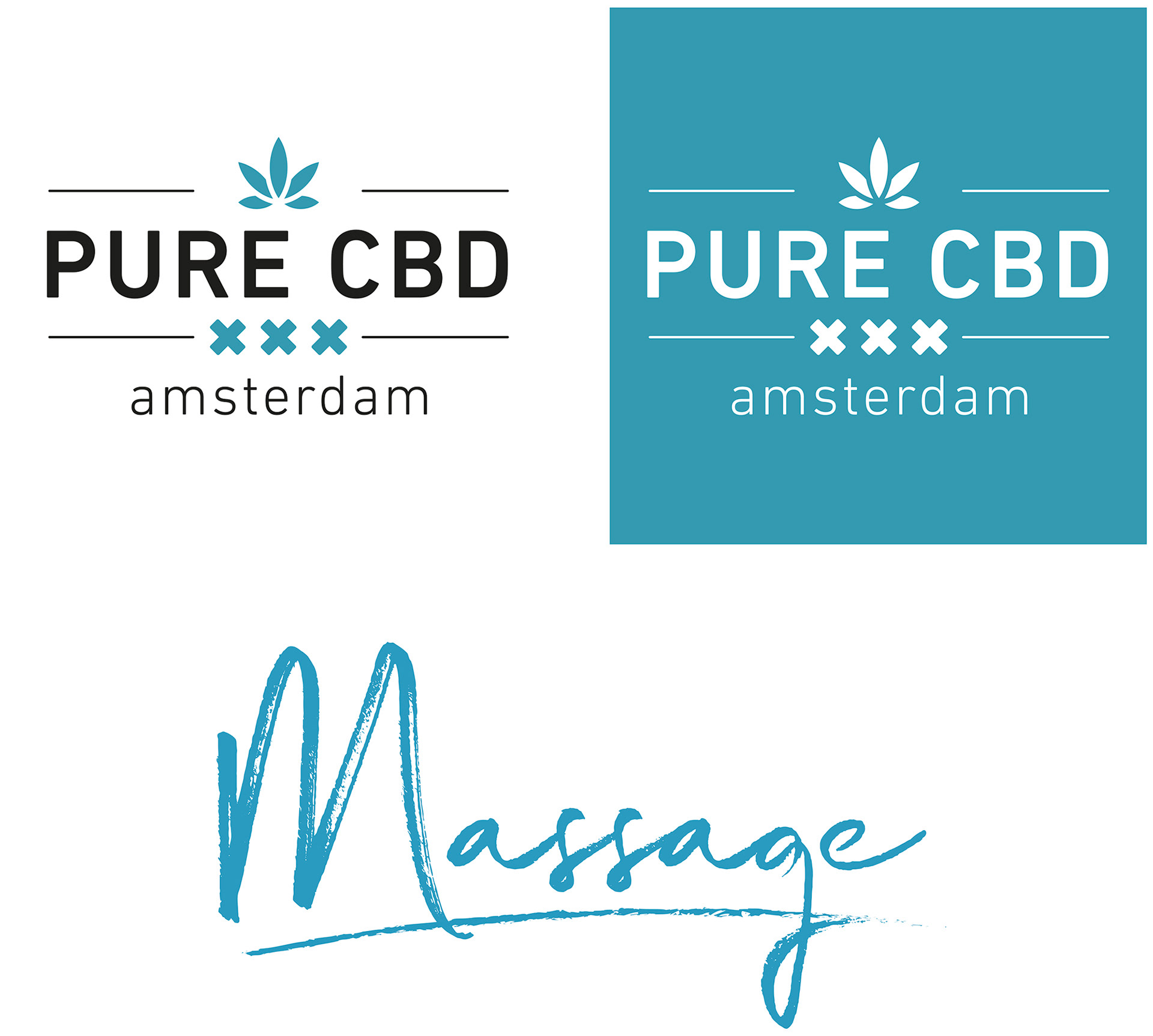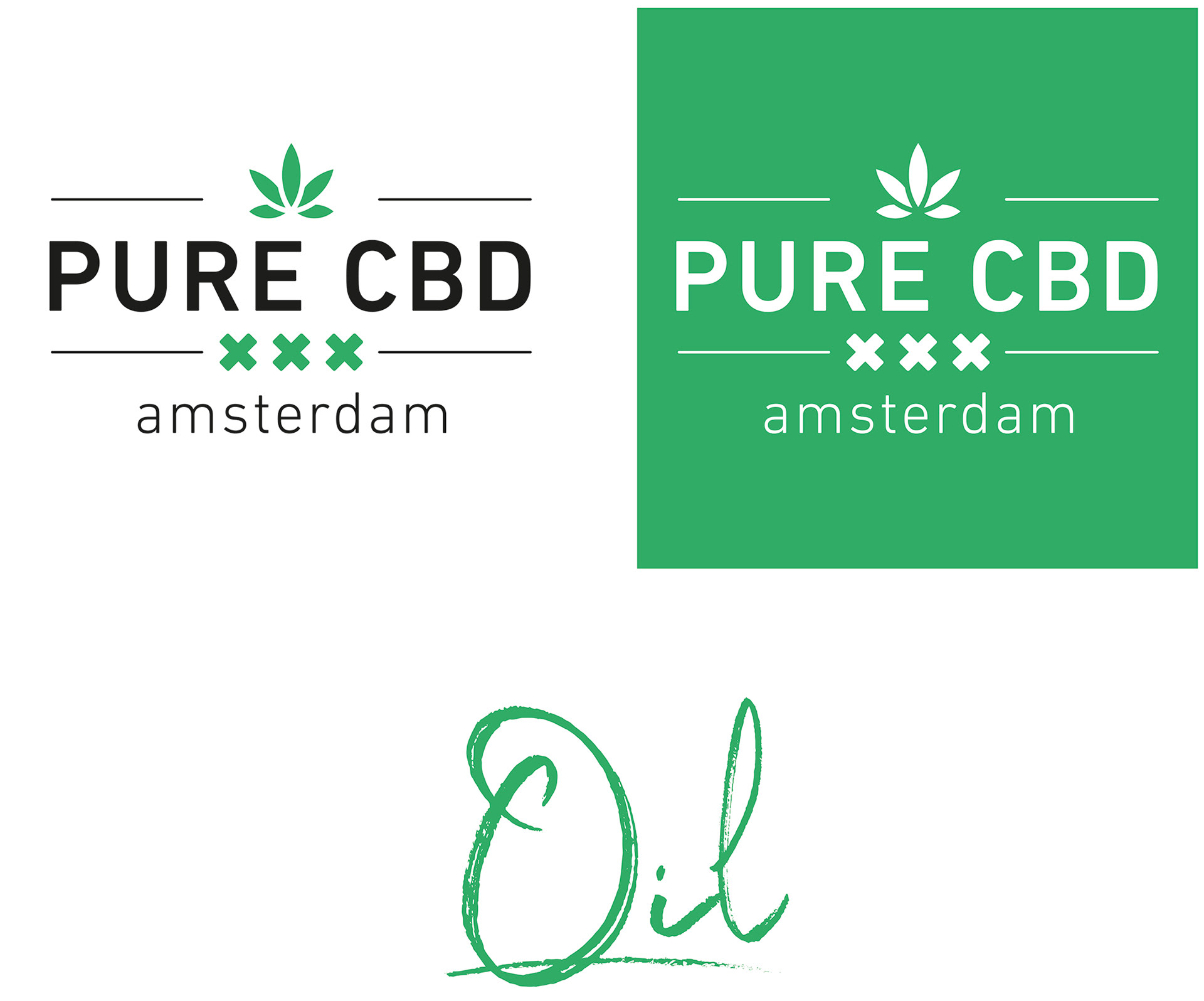 Identiteit voor Pure CBD Amsterdam, inclusief het ontwerp van het logo en de doorvertaling naar de drie productlijnen: Oil, Massage en Cream.