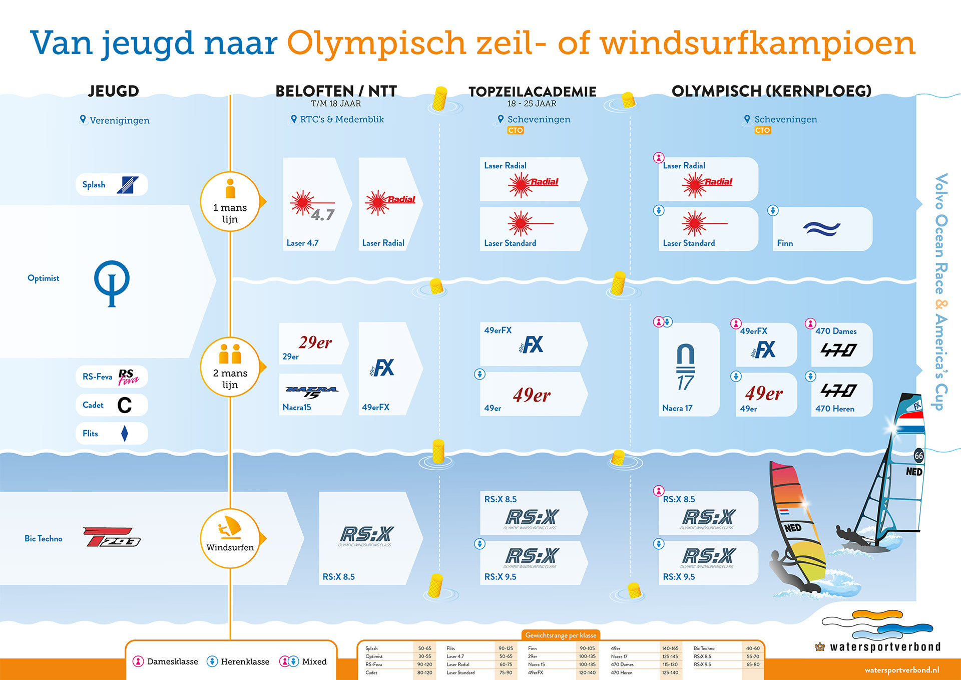 _ Het Watersportverbond heeft een voorkeurslijn ontwikkelt voor jonge zeilers en windsurfers die het ver willen gaan schoppen. De hele weg van junior tot Olympisch zeilkampioen. Wij maakten deze infographic van alle informatie. Goed te zien is waar en wanneer je welke klassen en boten moet doorlopen om je ambities waar te maken.
